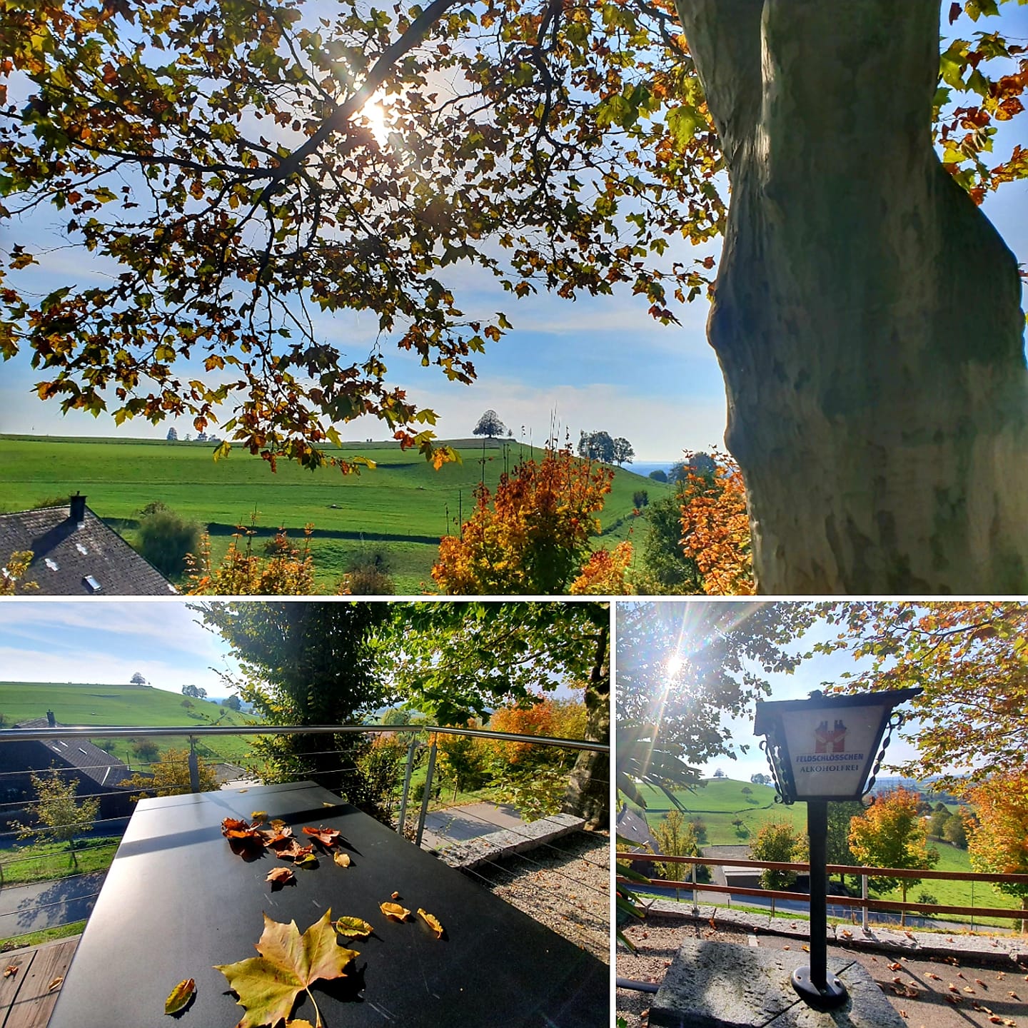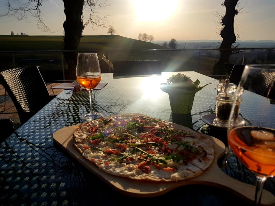 Geniessen Sie im Sommer auf unserer grossen Terrasse, umgeben von alten Bäumen und herrlichem Ausblick bis zum Jura, ein Glas Wein zu einer leckeren Spezialität. Die Kinder können auf dem Spielplatz toben und den Reitern wird das Getränk auch gerne über den Zaun gereicht.